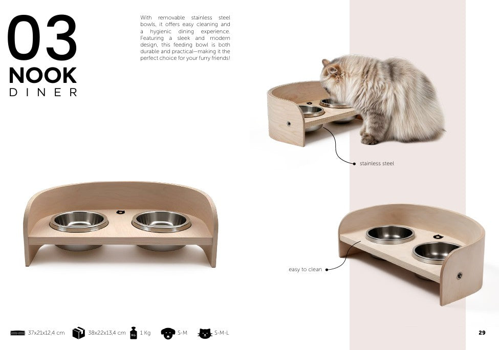 03NOOK DINNER with removable stainless steel bowls, it offers easy cleaning and a hygienic dining experience. Featuring a sleek and modern design, this feeding bowl is both durable and practical—making it the perfect choice for your furry friends!