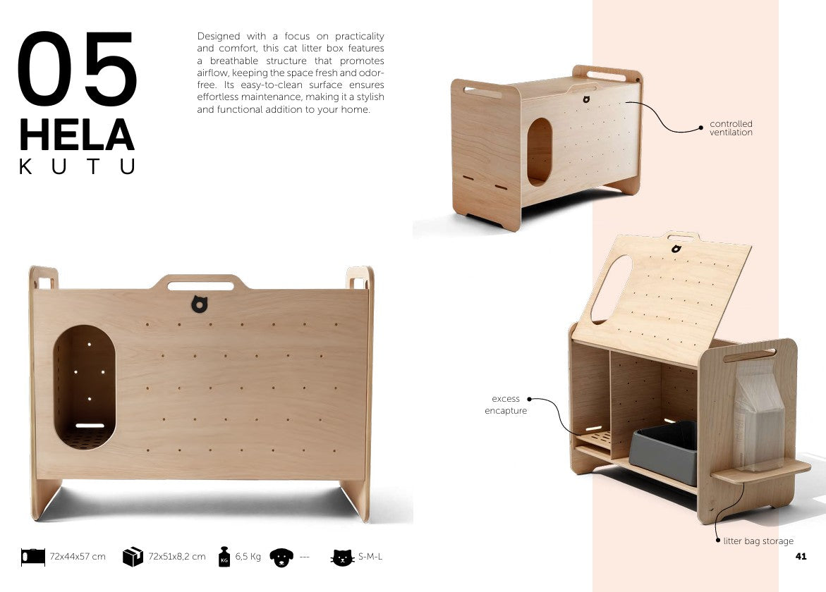05HELA KUTU Designed with a focus on practicality and comfort, this cat litter box features a breathable structure that promotes airflow, keeping the space fresh and odorfree. Its easy-to-clean surface ensures effortless maintenance, making it a stylish and functional addition to your home. This smart cat litter box features a walking corridor that removes excess litter from your cat’s paws, keeping your home cleaner. It also includes a customizable litter bag storage that can be placed on either side, adapting to your space. The perfect blend of functionality and design for you and your cat.