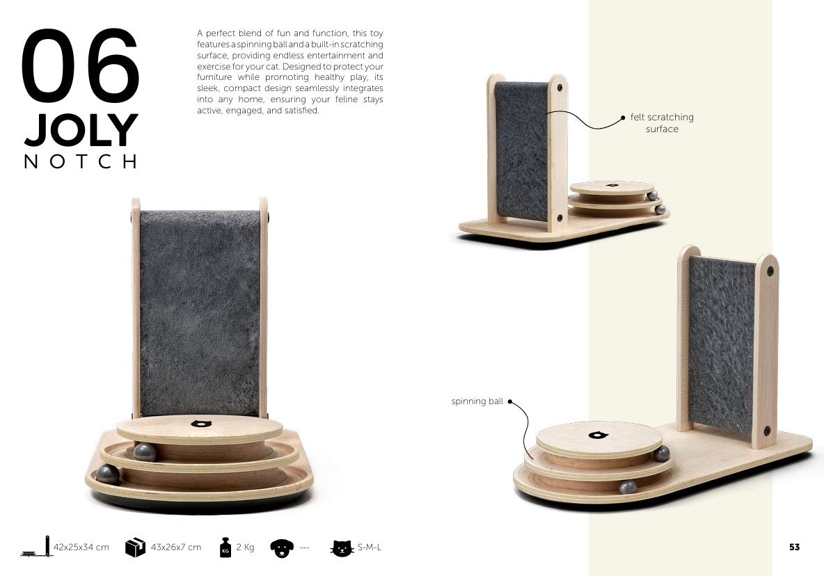 06 JOLY NOTCH A perfect blend of fun and function, this toy features a spinning ball and a built-in scratching surface, providing endless entertainment and exercise for your cat. Designed to protect your furniture while promoting healthy play, its sleek, compact design seamlessly integrates into any home, ensuring your feline stays active, engaged, and satisfied.