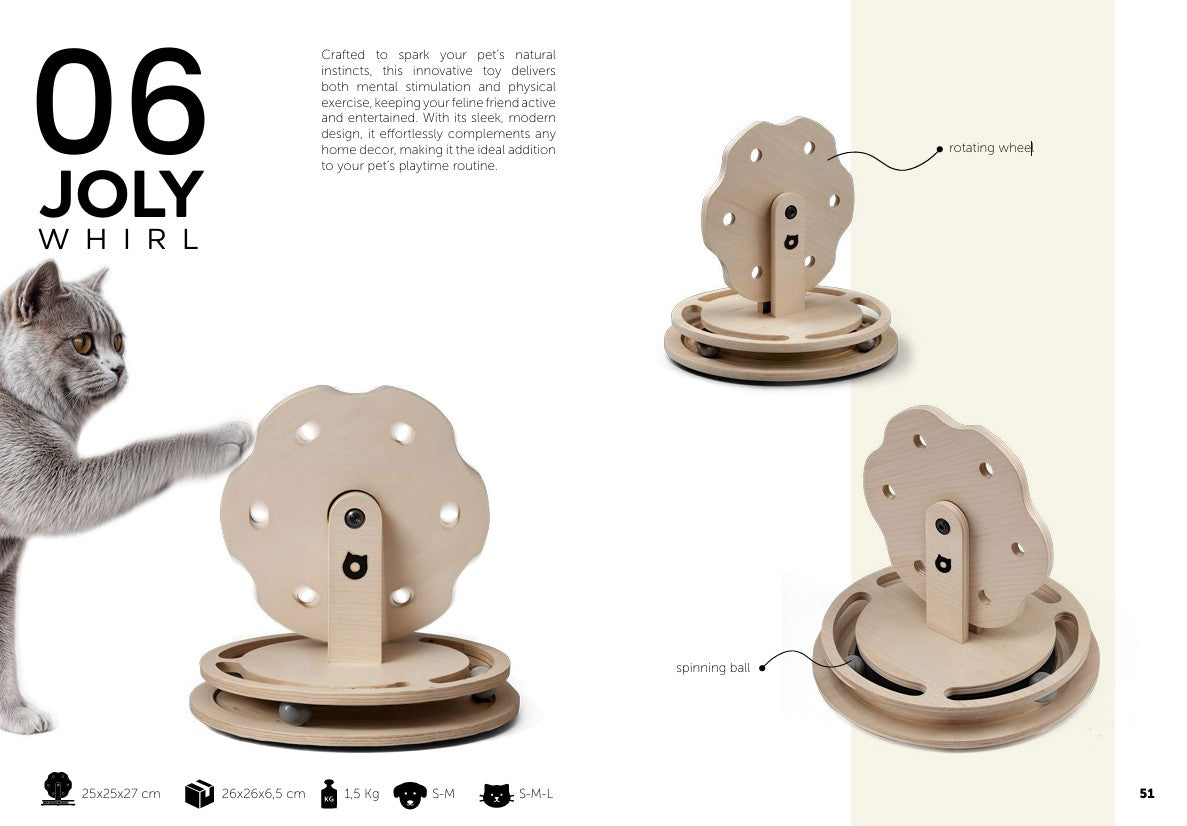 06 JOLY WHIRL Crafted to spark your pet’s natural instincts, this innovative toy delivers both mental stimulation and physical exercise, keeping your feline friend active and entertained. With its sleek, modern design, it effortlessly complements any home decor, making it the ideal addition to your pet’s playtime routine.